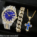 Ensemble de 3 pièces de luxe comprenant une montre plein diamant, un bracelet et un collier pour hommes. Style Hip Hop mode avec calendrier et mouvement à quartz. Design éclatant et tendance pour un look urbain raffiné. Vendu sans boîte.